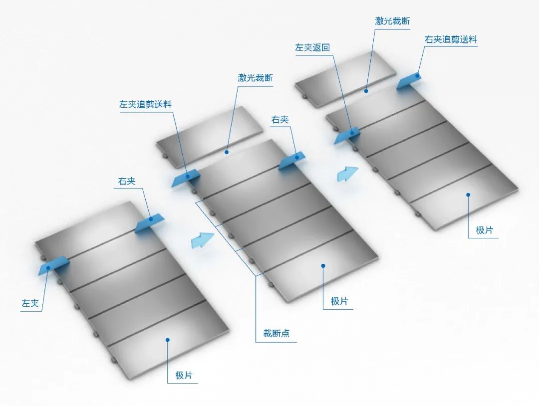 在切割极片时,使用夹子,将极片在左右夹速度一致时切割完成,然后夹子抬起加速下料,下料完成后加速回到起始位置等待下一次检测极耳后运行,左右交替实现左右换手动作。