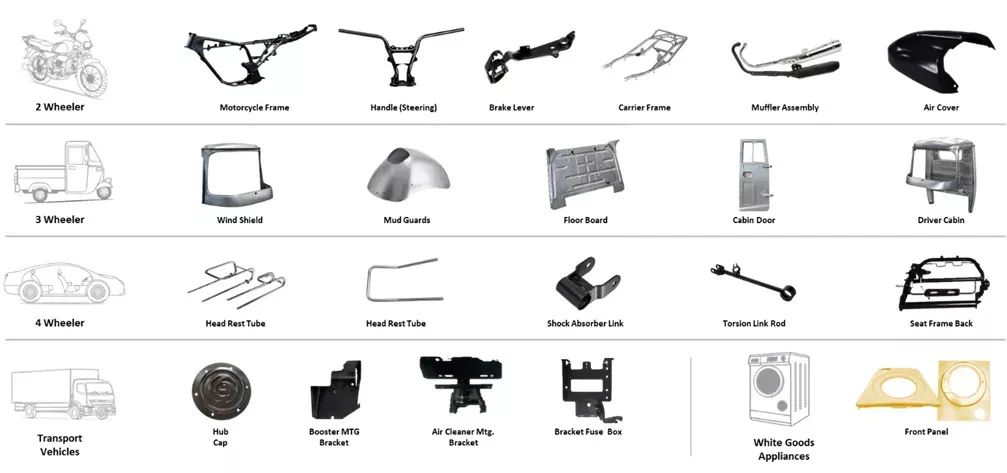 公司主要为领先的汽车原始设备制造商生产钣金件、管状制造组件和子组件。MetalMan拥有强大的基础设施,包括内部表面处理设备,如镍铬(ni-cr)电镀、电泳沉积(CED涂层)、环氧粉末喷涂和磷化处理,以及专用的CAD CAM软件和测量设备。
